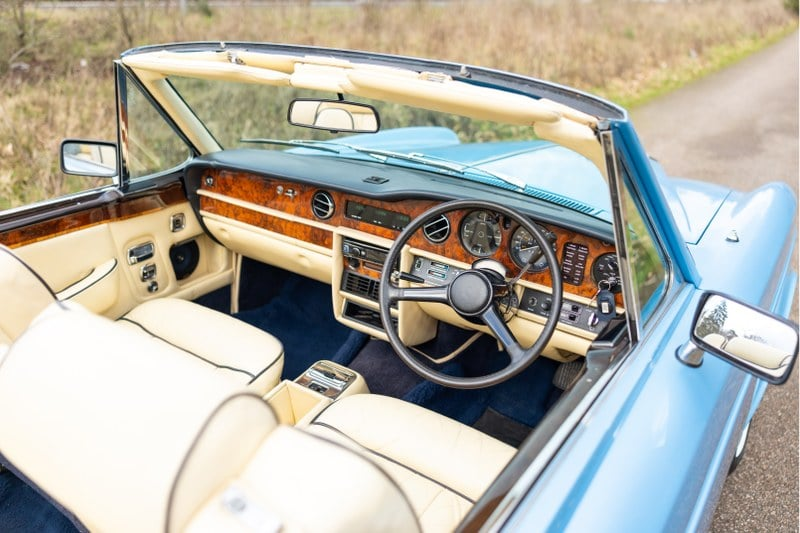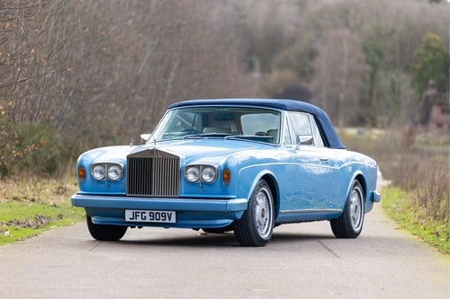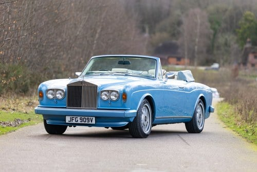 This wonderful example is offered in blue coachwork with a cream leather interior and looks fantastic. Registered new on 22nd April 1980 it comes complete with its original registration number ‘JFG 909V’ and is presented in good condition throughout, the paintwork shows little sign of age, and the interior is well presented and benefits from an upgraded radio. Accompanying the car is a sizeable history file which contains original maintenance books and many bills and invoices totalling over £25, 000. Notable works undertaken include fitment of an upgraded fuel injected engine, along with many MoT records, and various general servicing and maintenance invoices. In February 2026, this Corniche was treated to further maintenance and a major service which included replacement spark plugs, an oil and filter change, new suspension spheres fitted to the front end, four new tyres balanced and fitted, and a fresh MoT test certificate valid until March 2026. At this time the Rolls-Royce was also road tested and is reported to be in very good running and driving condition. The car has been used and enjoyed as intended throughout its life and has been entered into various classic car shows, where it has consistently performed very well. Dry stored and always kept trickle charged, this fantastic looking example will be driven to the auction by the vendor (circa 65 miles) and is ready to be enjoyed immediately by its new owner.